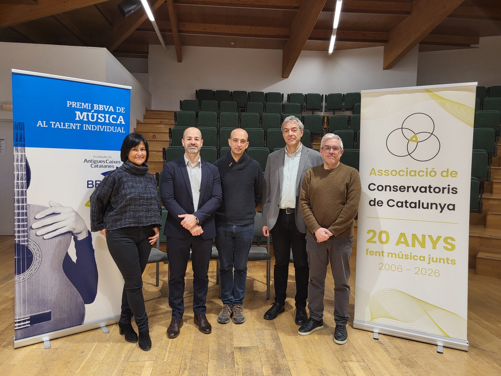 Belén Latorre (directora de la Fundació Antigues Caixes Catalanes), Carles Monroy (director comercial de Banca Privada de BBVA a Manresa), Pol Huguet (regidor d’Educació de l’Ajuntament de Manresa), Lito Iglesias (president de l’Associació de Conservatoris de Catalunya) i Robert Baquero (director del Conservatori Municipal de Música de Manresa).